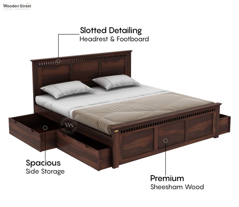 Adolph Sheesham Wood Queen Size Bed With Side Storage (Walnut Finish)