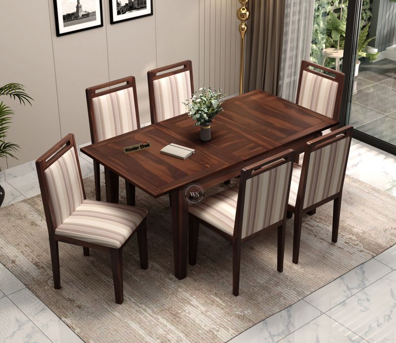 Taylor 6 Seater Dining Set with 6 Premium Upholstered Chair | Extendable from 4 to 6 Seater | Cream Stripe Fabric Cotton (Walnut Finish)